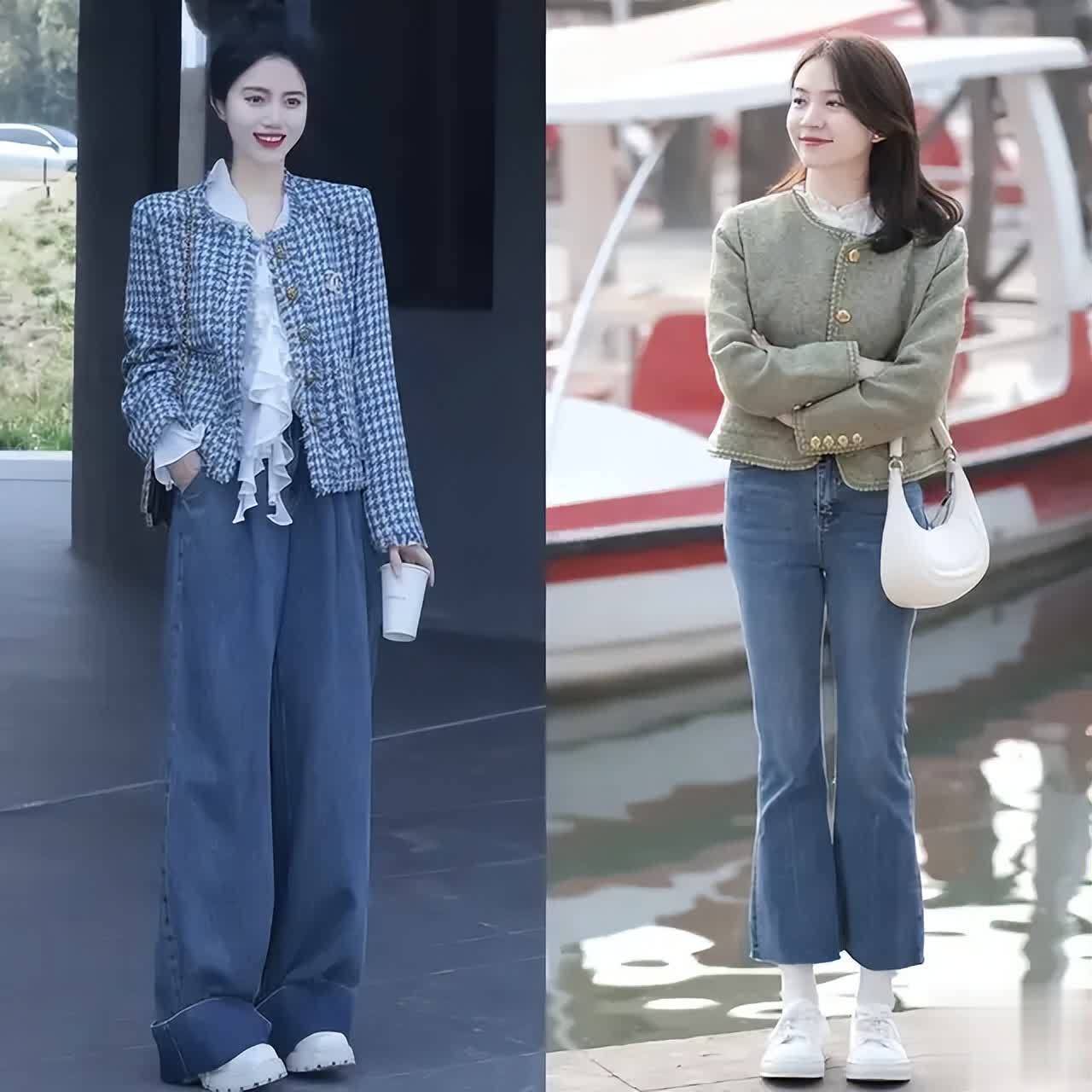 小香风外套,不管是小个子女性还是高个子女生穿的都好看,例如下面这一件蓝白格纹的小香风,内搭一件木耳边的白色衬衫,下半身是一条比较有垂坠感的蓝色牛仔阔腿裤,这样的穿搭就形成了上短下长的搭配,看起来就能让你的腿部线条变得更加修长。