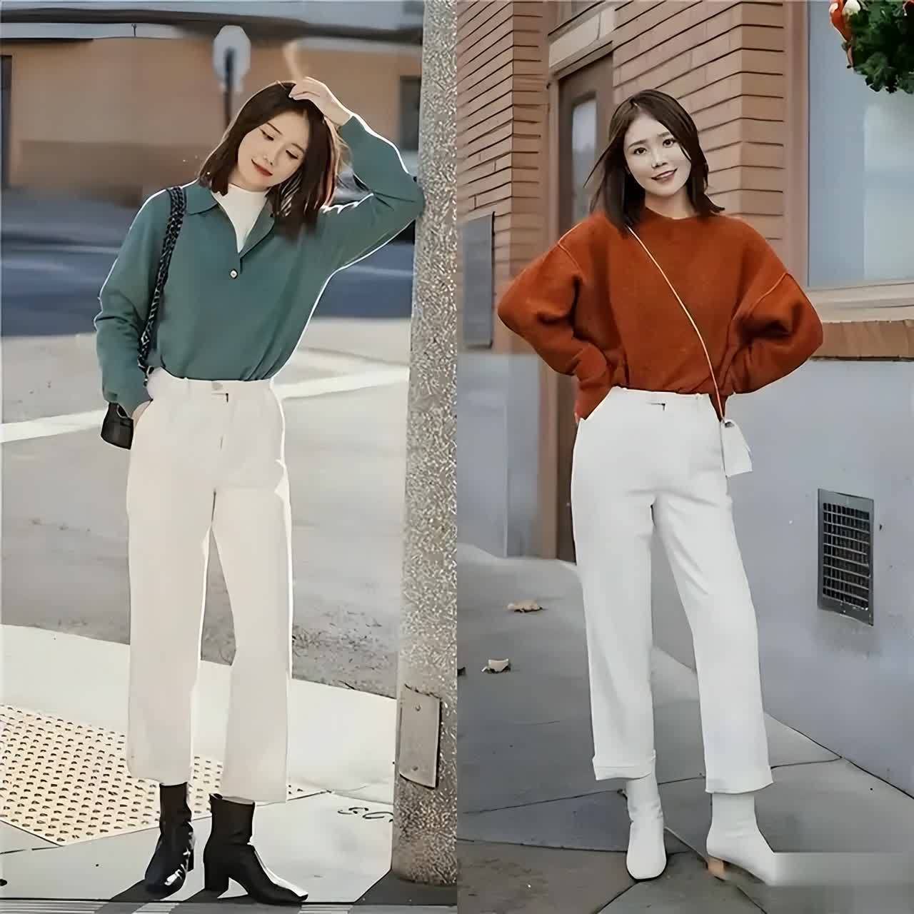 不过,在选择针织衣服单品的时候,一定要选那种纯色系,这样搭配色彩才不会显得凌乱,比如下面用一件棕色的针织上衣,搭配上白色的直筒长裤,脚上穿了一双白色的短靴,这样的搭配温柔大方,简约干练。