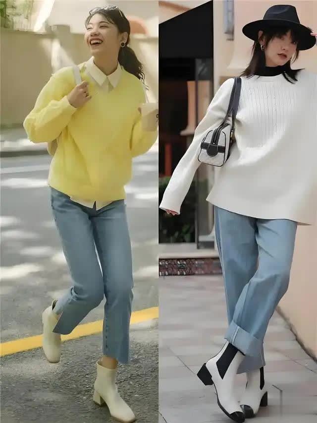在北方城市生活的女生,确实可以选择用针织衣服单品来搭配上一条长裤了,这样会更加的保暖,例如下面用一件黄色的针织上衣叠加浅黄色的衬衫,加上一条蓝色的牛仔9分裤,脚上穿的是一双黄色的短靴,鞋子和衣服色彩形成了一个首尾呼应的效果,让整个造型色彩搭配变得更协调。