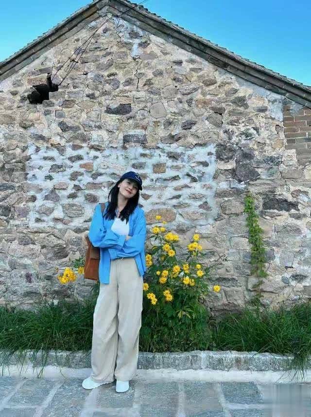想要更休闲一点,我们还可以借鉴高圆圆下面这一套穿衣打扮,用一件浅蓝色的衬衫上衣,内搭白色短袖T恤,加上一条浅卡其色的直筒阔腿裤,加上穿了一双小白鞋,头上带来一顶棒球帽,出门旅游拍照就很出片。