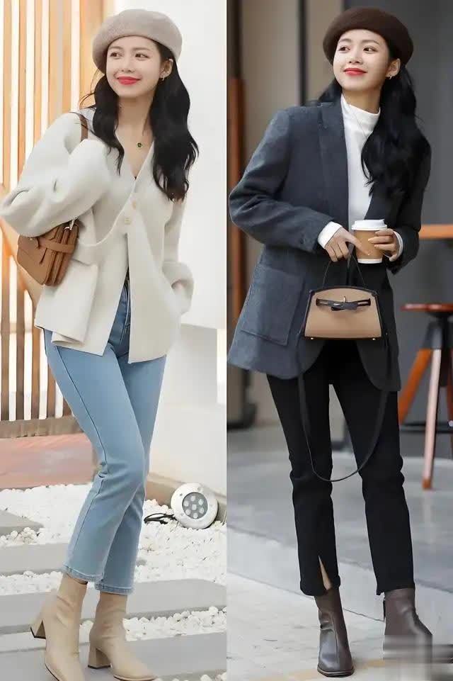 还可以用针织衫作为内搭,例如下面右边的这一套就用了白色的针织衣服作为内搭之后,再加上灰色的西装外套,下半身是一条黑色的收脚裤,脚上穿的咖色的皮质短靴,头上戴了一顶咖色的贝雷帽,这样的穿搭显得又飒又美,非常适合职场女性。